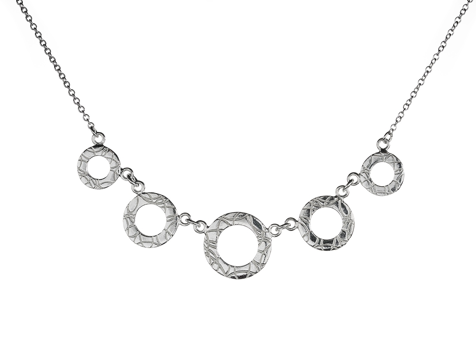Ihastuttava Leikki muistuttaa siitä, että elämä on nyt! Näyttävä riipus muodostuu viidestä erikokoisesta kauniisti viimeistellystä renkaasta. Kaulakorun kruunaa ajaton ankkuriketju. Koru on valmistettu 925 hopeasta. Tuo ilonhetkiä jokaiseen päivään kauniin Leikki-kaulakorun avulla!